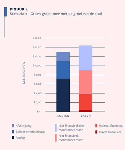 De grafieken tonen zowel kosten als baten. Tot de kosten behoren aanleg, beheer en onderhoud en afschrijving (het tussentijds vervangen van plantgoed). [1] De baten omvatten directe financiële opbrengsten, indirecte financiële baten en niet-financiële baten, waarvan een deel monetariseerbaar is. De grootste monetariseerbare baten zijn vermeden gezondheidskosten (onder meer door betere luchtkwaliteit), klimaatmitigatie via CO₂-opslag en vermeden waterschade. Daarnaast zijn er niet-financiële, niet-monetariseerbare baten: kwaliteitsvol groen versterkt de biodiversiteit en bevordert een gezonde leefomgeving, met positieve effecten op mentale gezondheid en beweging. Volgens de onderzoekers vertegenwoordigen deze baten het grootste aandeel, al is hun omvang in de grafieken slechts illustratief omdat ze (nog) niet in euro’s uit te drukken zijn. De bateninschatting is bewust conservatief; naarmate het wetenschappelijk inzicht groeit, verwachten de auteurs dat de totale baten eerder zullen toenemen dan afnemen.