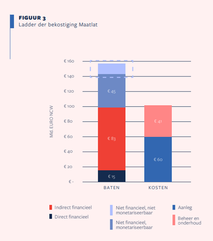 Bij de baten worden enerzijds direct financiële opbrengsten (meetbare geldstromen zoals verkoopopbrengsten) en indirect financiële baten (indirecte voordelen voor bedrijf vb. bedrijfsreputatie, bedrijfsinnovatie, …) gerekend. Daarenboven worden niet-financiële baten toegevoegd, waarvan sommige monetariseerbaar zijn. De grootste monetariseerbare baten zijn vermeden gezondheidskosten dankzij bijvoorbeeld betere luchtkwaliteit, klimaatmitigatie (door CO2-opslag) en vermeden waterschade. Ten slotte zijn er de niet financiële, niet monetariseerbare baten: kwaliteitsvol groen versterkt de biodiversiteit en zorgt voor een gezonde leefomgeving die onder meer mentale gezondheid en beweging stimuleert. De onderzoekers kennen aan de niet-financiële, niet monetariseerbare batenpost het grootste aandeel toe: kwaliteit van de leefomgeving geeft mens, dier en plant een grote impuls en valt niet te onderschatten, vinden ze. Aangezien deze post echter (nog) niet monetariseerbaar is, is de grootte van dit aandeel in de grafiek zuiver illustratief. Niettemin beschouwen ze hun batenbeoordeling conversatief en verwachten ze naarmate dat wetenschappelijk onderzoek vordert, de totale baten op termijn eerder hoger dan lager zullen uitvallen.